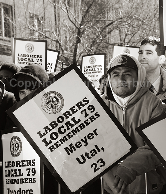 Laborers Local 79: Member of Local 79 carries a sign bearing the name of one of the dead from the fire. 3/35/11